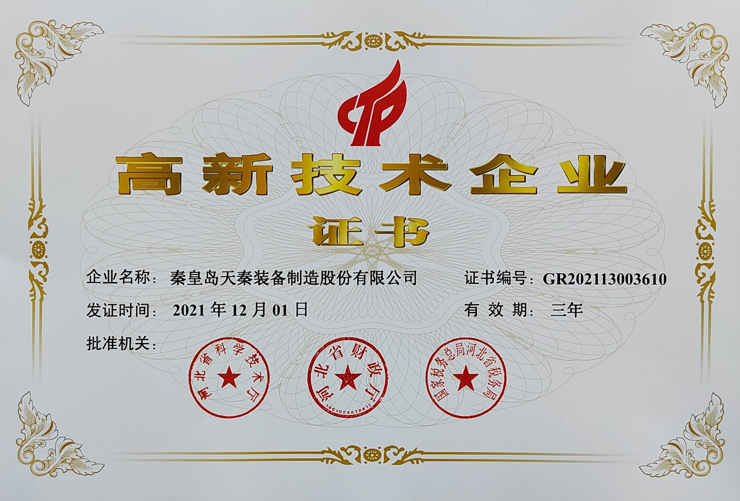 • 秦皇島天秦裝備制造股份有限公司創(chuàng)立于1996年,總部位于河北省秦皇島市經(jīng)濟技術開發(fā)區(qū),秦皇島廠區(qū)占地4萬平方米,擁有3萬平方米的標準廠房、辦公樓和工程技術研發(fā)中心;分部天津廠區(qū)位于天津市靜海經(jīng)濟開發(fā)區(qū),占地2萬平方米,擁有1.6萬平方米標準廠房。 公司通過了GB/T 19001質量管理體系及GB/T 24001環(huán)境管理體系認證,是國家高新技術企業(yè)、河北省軍民融合產(chǎn)學研用創(chuàng)建基地,建有省級院士工作站。